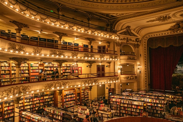 In mijn zoektocht kwam ik ook deze boekenwinkel tegen en die wilde ik je niet onthouden, want volgens het internet is de mooiste boekenwinkel ter wereld te vinden in Buenos Aires: Ateneo Grand Splendid. Dit oude theater is omgebouwd tot een soort boekentempel waar de verhalen het podium krijgen dat ze verdienen. De plafonds zijn beschilderd met prachtige fresco’s en de balkons staan boordevol met boeken en verhalen. Op deze plek werden in de jaren ‘20 van de vorige eeuw de eerste films met geluid vertoond in Argentinië. Een plek vol geschiedenis, beelden en verhalen dus.